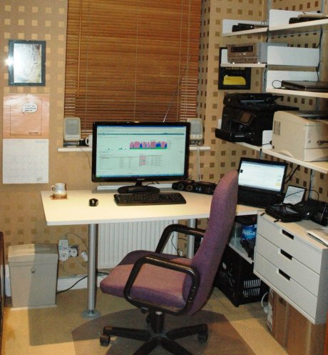 This is office 2.0. Earlier this year I finally cleared out the 20-year old computer desk and installed this desk and shelving system. I also treated myself to a new KVM switch and monitor.