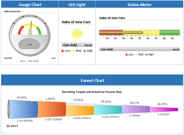 The development team have introduced some new charting types to the toolset. We were already able to select from quite a few options, however we’ve now got Gauges, the LED lights, Status Meters and Funnel charts.