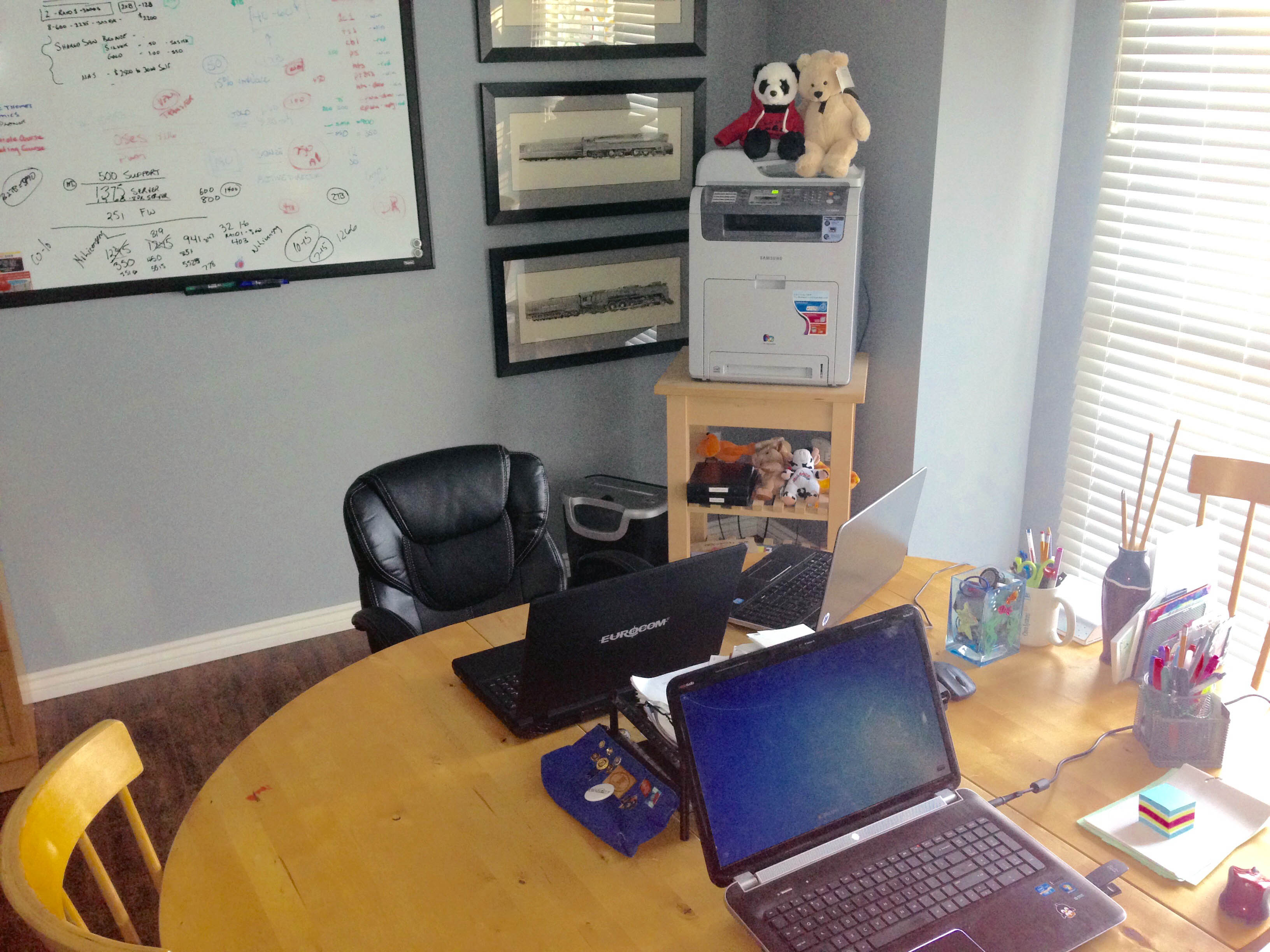 Currently, I am working from home (love it) and have a nice view of the yard from the office. I have an iMac and 2nd monitor on the desk. I run my Windows VM on the right monitor (an OS X workspace) and use the left monitor for Mac apps. I use the workspaces features on OS X to keep my apps logically organized. For example, Evernote and OmniFocus share a workspace, Mail and Slack in a workspace, and Safari or Chome in a 3rd.
