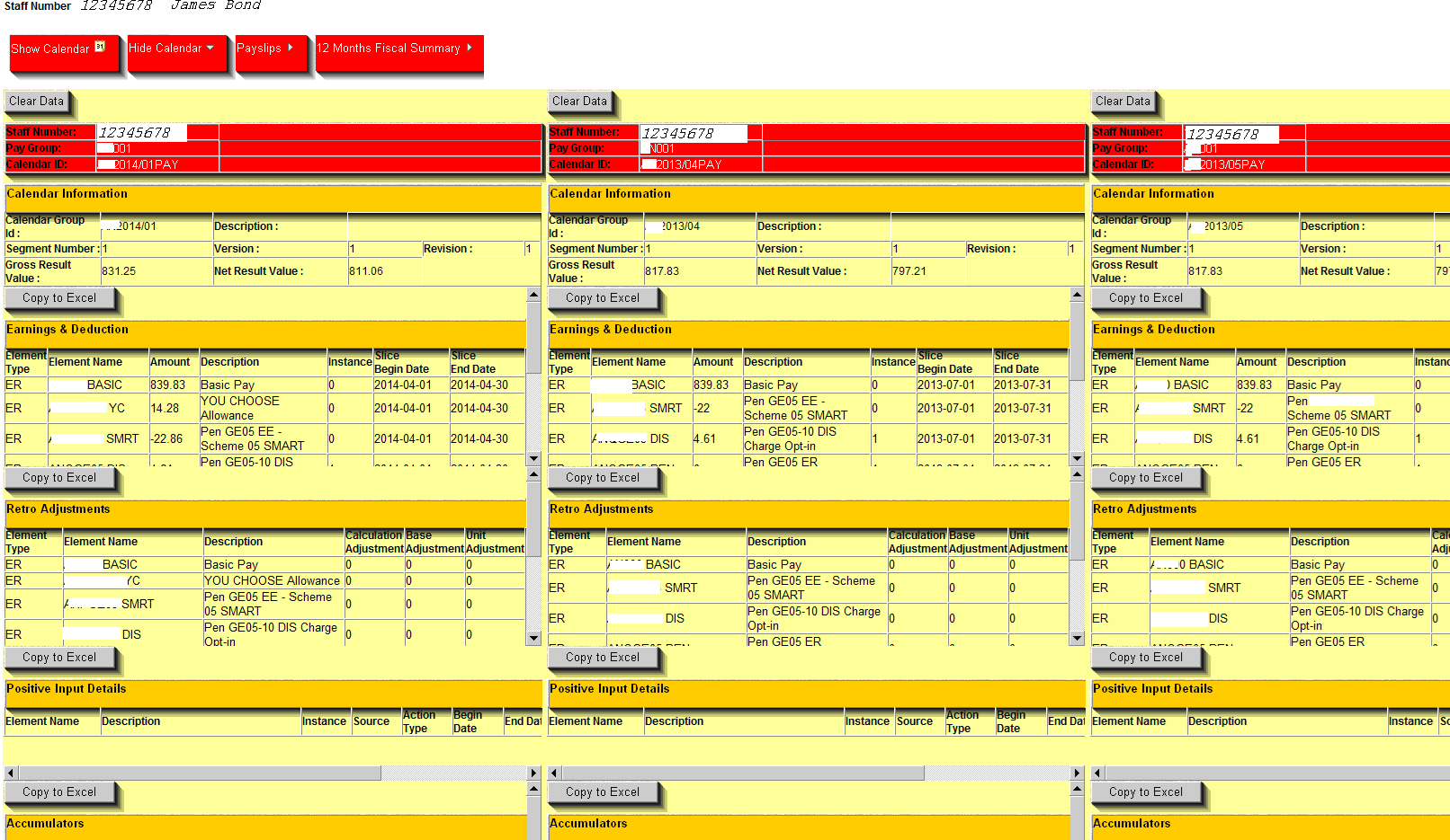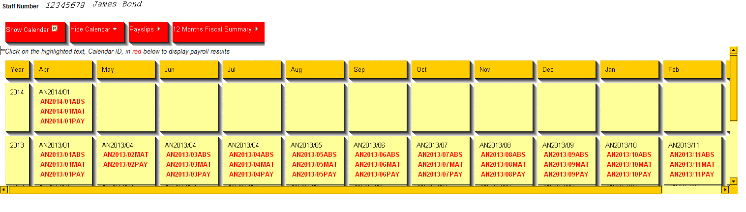 This example shows a custom built payroll results calendar which allows the user to display multiple sets of payroll results information on a single page, without needing to navigate out of the page as is currently delivered.