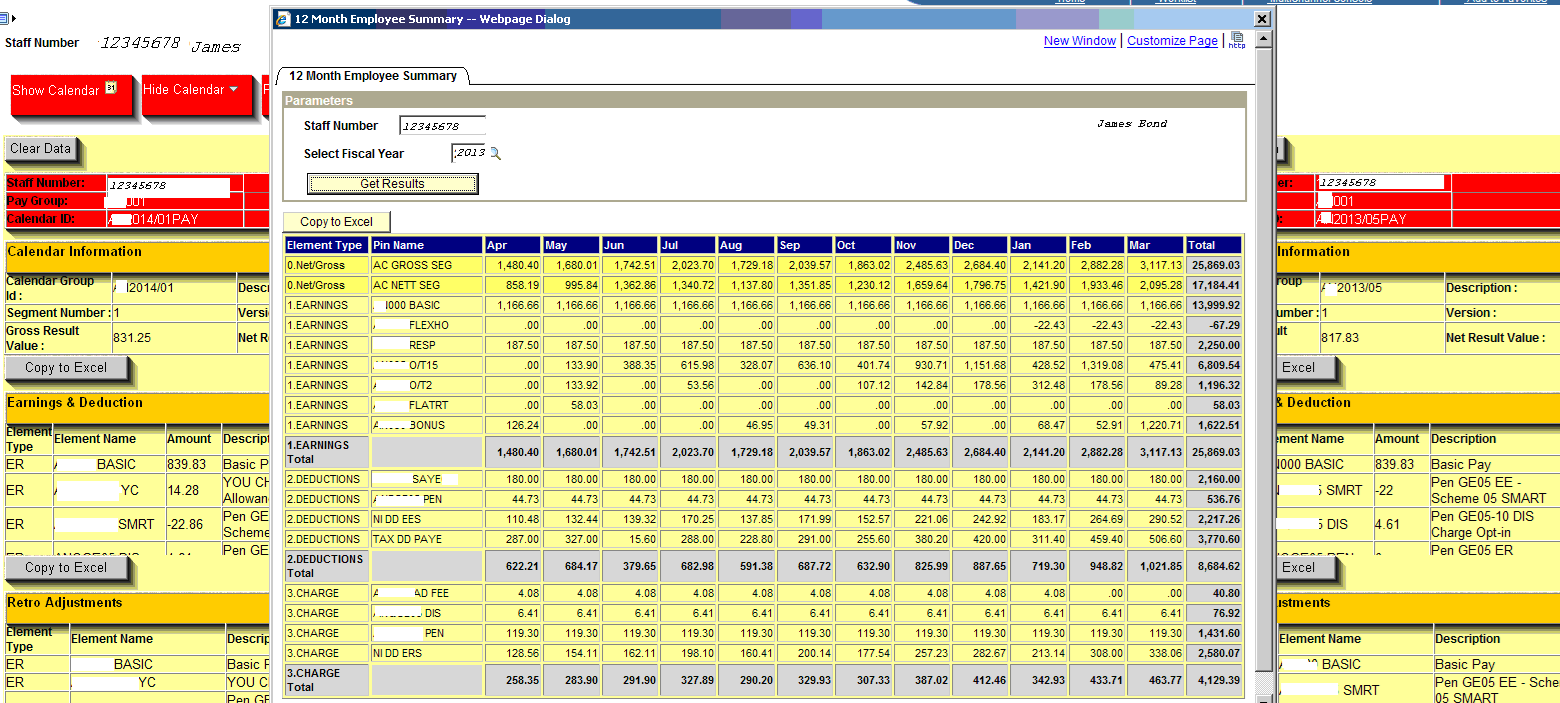 Additionally, it allows the display of related information such as payslip and 12 Months Fiscal Summary (pivoted summary results).